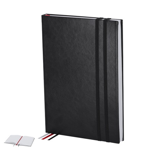 Bloc de notas en tamaño A5 con cubiertas rígidas y suaves, elaborado en PU reciclada y RPET. Marcapáginas en cinta en tres colores diferentes (negro, rojo y gris) para fácil planificación del día a día y doble cinta elástica de cierre a juego. Incluye 128 hojas color blanco con disposición a rayas y un práctico bolsillo de papel para notas sueltas. Ideal para llevar un diario y mantener la planificación durante todo el año. Con distintivo de PU Reciclado.La PU Reciclado destaca por su resistencia y elasticidad. Este material reciclado y reciclable es una opción sostenible que rescata las fibras desechadas en los procesos de fabricación, minimizando así el desperdicio de material y contribuyendo a su vez a reducir el impacto ambiental, manteniendo a la vez sus propiedades originales.