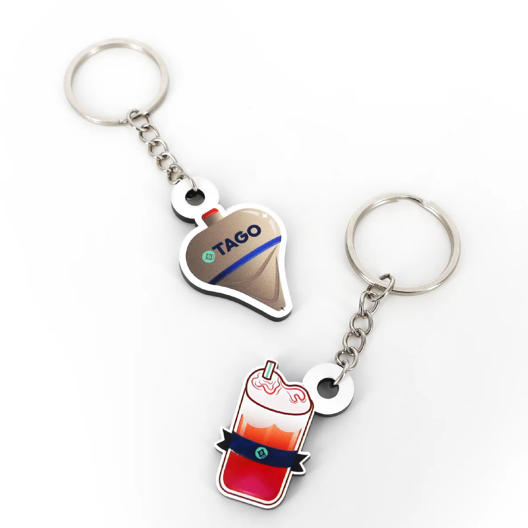 Llaveros que incorporan capas de textura, relieve y barniz, logrando un acabado brillante que eleva cualquier diseño y lo aleja de lo plano.