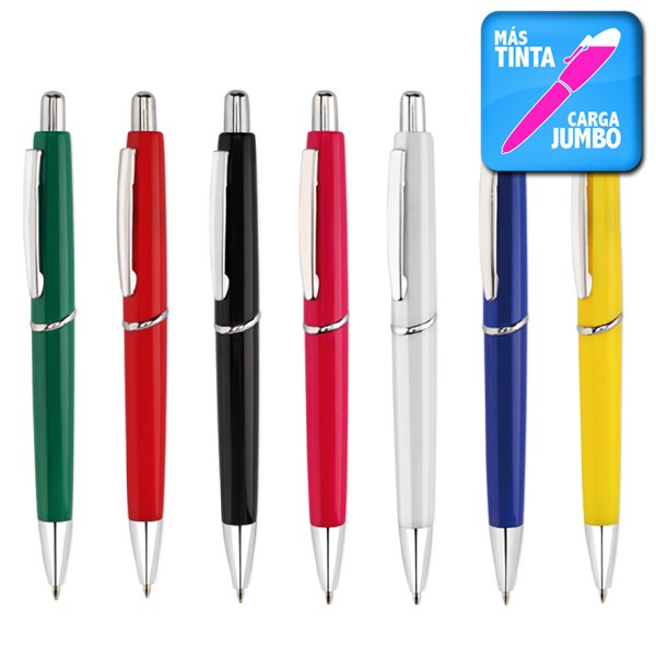 Bolígrafo de mecanismo pulsador de elegante diseño bicolor con accesorios en color plateado brillante y cuerpo de suave acabado en llamativos colores sólidos. Con clip metálico y anilla a juego. Tinta azul. Carga Jumbo