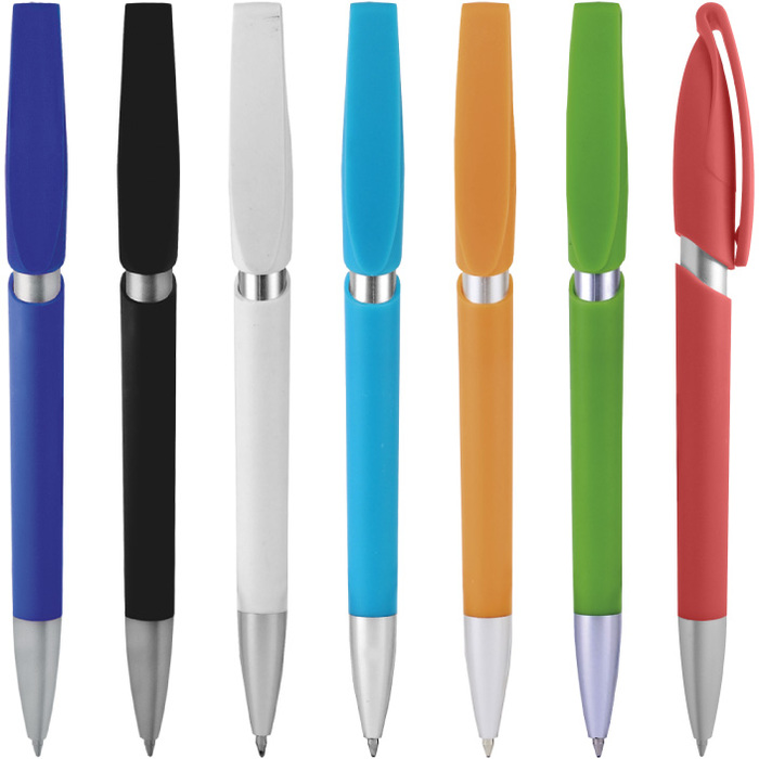 Plástico. Apertura retráctil con pulsador. Clip plástico, color plata en punta y cuerpo. Tinta negra.