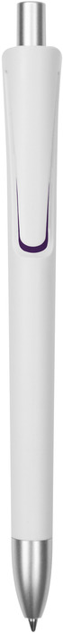 Plástico. Cuerpo blanco mate. Clip, punta y pulsador color plata. Debajo del clip detalle de color. Tinta azul.