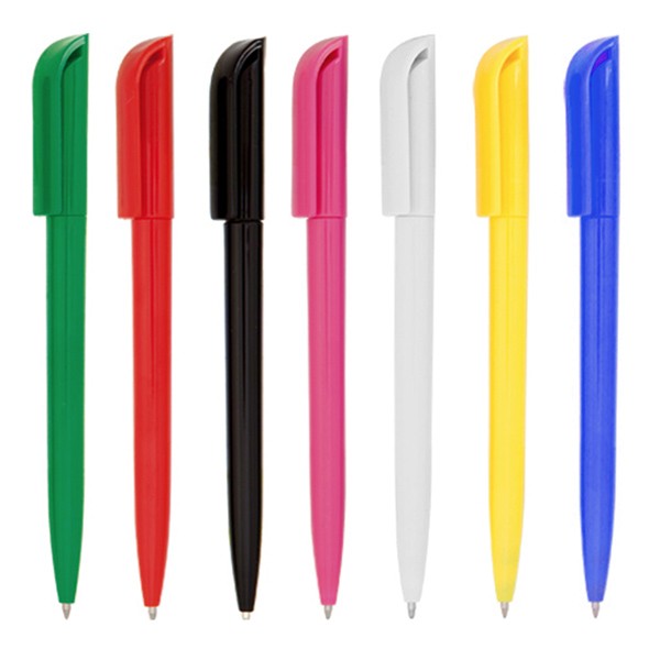 Bolígrafo de mecanismo giratorio con cuerpo de suave acabado en alegres colores sólidos y con clip plano. Tinta azul.