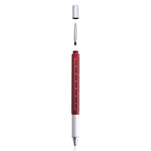 Bolígrafo multiherramienta 4 en 1 de mecanismo giratorio, en variados colores y con suave empuñadura. Con nivel integrado en cuerpo, regla con sistema métrico en centímetros/pulgadas y destornillador de doble cabeza -plana y de estrella-. Con clip metálico y tinta azul. 1 Accesorio. 5 Funciones