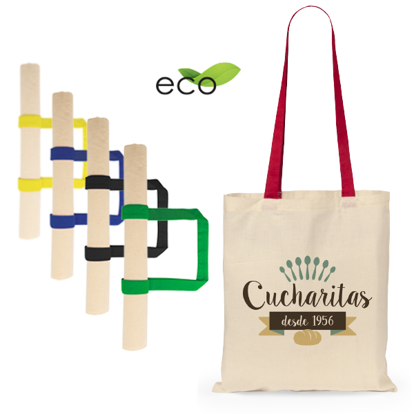 Bolsa en material 100% algodón en combinación de cuerpo en color natural y asas en variada gama de vivos colores. Con asas largas de 70cm y acabado cosido. Resistencia hasta 7kg de peso.