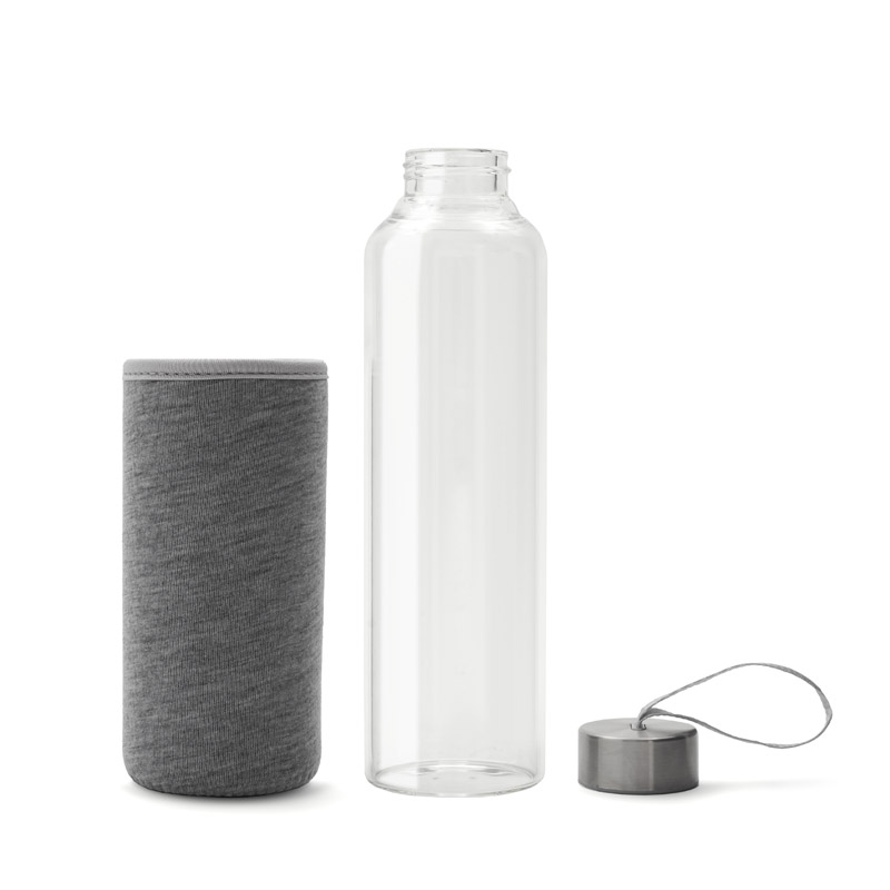 Botella de vidrio borosilicato con funda protectora de neopreno. Tapa a rosca con cinta, para facilitar el agarre y transporte. Capacidad de 550 ml. Reutilizable. Ideal para tus actividades al aire libre o uso diario. Incluye Gift Box confeccionada en cartulina Kraft. El descuento ya se encuentra aplicado sobre el precio de la web