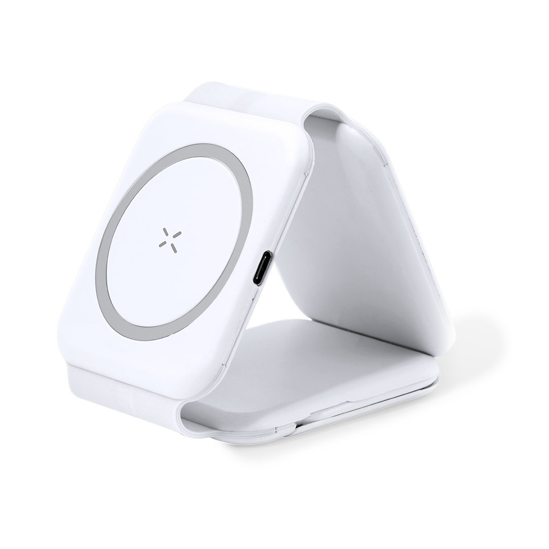 Completo cargador inalámbrico magnético 15W, diseñado para la carga simultánea del smartphone, auriculares y smartwatch. Se trata de un gadget todo en uno: plegable, portable, de tamaño compacto y muy versátil. Incluye set de cables cargadores sincronizadores -aptos para transferencia de datos- con conexiones Micro USB, Tipo C y Lightning. Además, incorpora un accesorio eyector para tarjeta SIM. Elaborado en resistente ABS de color blanco y presentado en atractiva caja individual de diseño. Disponible manual de instrucciones en español e inglés. Fabricado conforme a los estándares RoHS y en cumplimiento con los siguientes requisitos de seguridad:??Sistema de protección contra sobrecalentamiento.?Sistema de protección contra sobrecarga.?Sistema de bloqueo para evitar cortocircuitos. Set Cables Cargadores Incluido. Apto para transferir datos. Conexión Micro USB, Tipo C y Lightning 5V DC 3A. Eyector de SIM Incluido