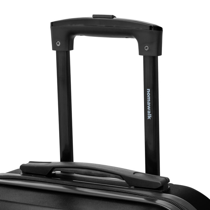 56 x 36 x 20 cm (total). Capacidad 34 litros. Peso aproximado 2,7 kg. 100% ABS. Interior 210D. Valija / Maleta pequeña. 8 ruedas con giro 360°. Manija de transporte reforzada y engomada. Mango extensible hasta 48 cm. 2 posiciones. Interior: 2 compartimentos principales con cierre y elásticos ajustables. Placa metálica desmontable para grabado (medida: 5,3 x 3 cm.) Candado incluido con combinación donde se enganchan los cierres.