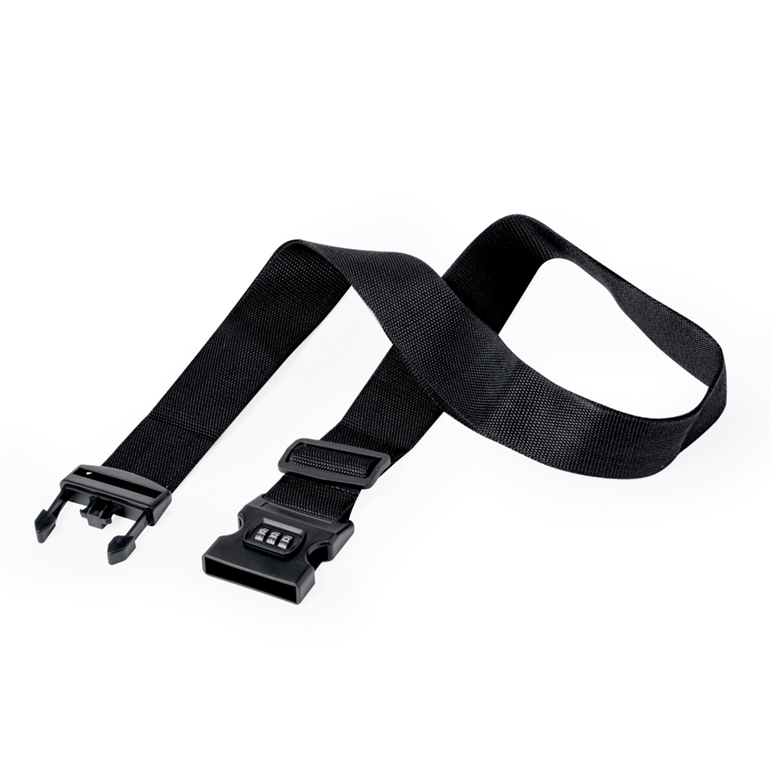 Cinta para maletas ajustable fabricada en resistente poliéster. Con cierre de hebilla ajustable y contraseña de 3 cifras. En discreto color negro y de 200cm de largo. Presentada en una bolsa individual de papel reciclado. Cierre Seguridad