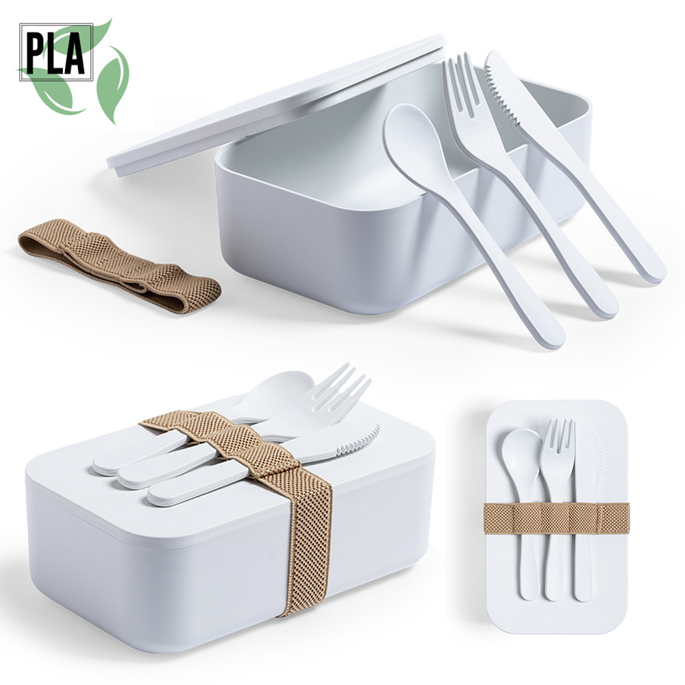 Fiambrera de línea nature, fabricada en PLA 100% compostable libre de BPA. De 1L de capacidad, incluye cinta de seguridad con tenedor, cuchara y cuchillo. Presentada en bolsa individual. Producto fabricado con material PLA, procedente de materias primas renovables, con importantes propiedades como la versatilidad y la resistencia, destacando entre todas ellas la de compostabilidad. 1 L