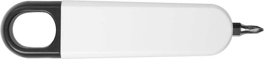 9 x 2 x 1,5 cm. Plástico. Herramienta destornillador con 4 puntas intercambiables que se guardan en el interior. El extremo de la tapa es imantado para el ajuste de las puntas.