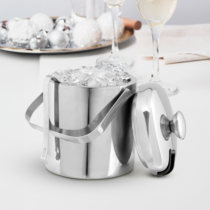 Ø 14 x 14 cm. Capacidad 1100 ml. Acero inoxidable. Interior en acero 304 y exterior en acero 201. Hielera de mesa con tapa. Pinza para hielo de acero inoxidable, encastrable en la misma tapa. Asa de acero inoxidable para transportar. Presentación en caja de regalo kraft.