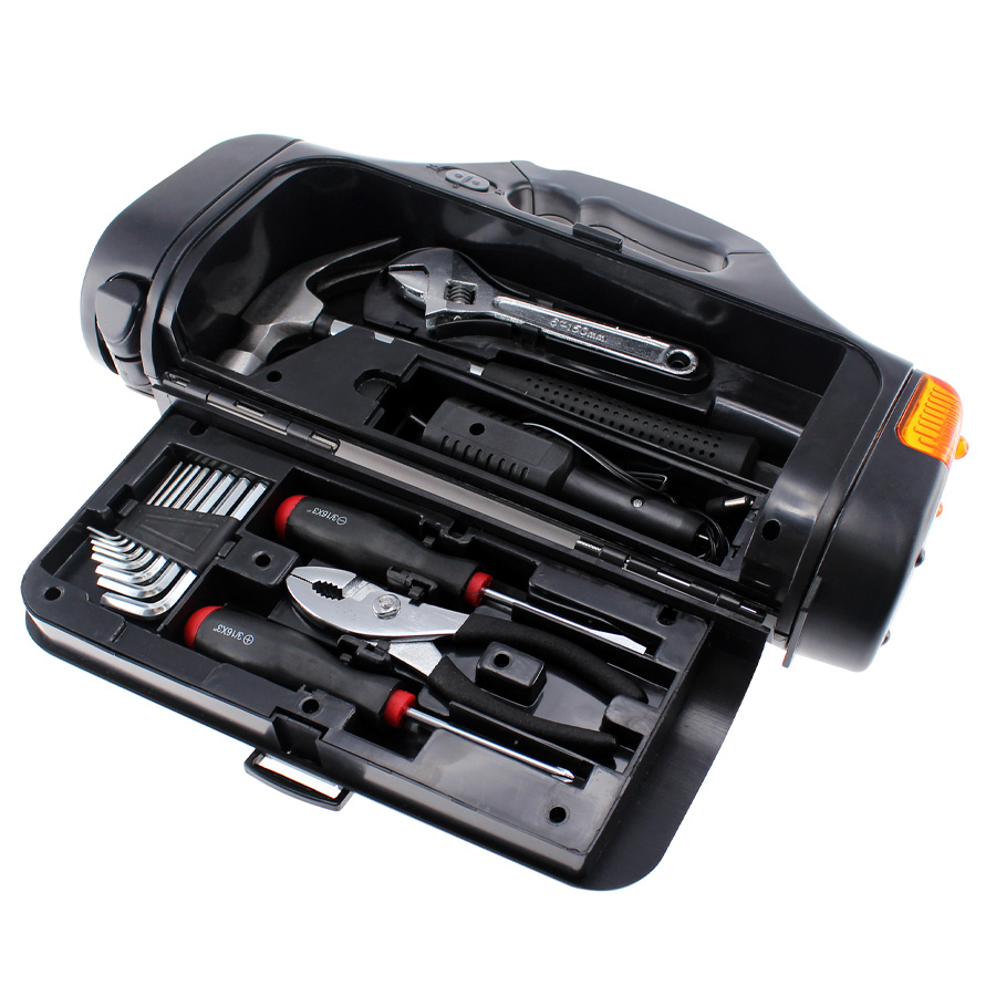 Kit de Emergencia para el Vehículo en plástico ABS negro. Incluye 13 Herramientas, Linterna, Luz naranja intermitente, 2 focos reflectantes redondos rojos y un cargador para conexión al encendedor del vehículo.