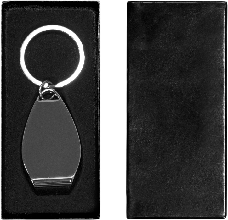2,8 x 1 x 5 cm Metal. Llavero plano que se puede usar como destapador. Presentación en caja de regalo.