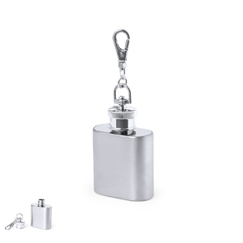 Práctico llavero petaca fabricado en acero inox, de 30 ml de capacidad. Tapón con cierre de seguridad a rosca y mosquetón giratorio. Presentado en caja de diseño kraft.