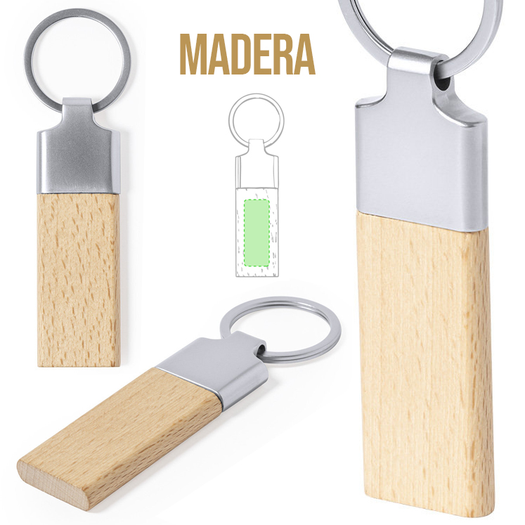 Llavero en combinación de materiales metal de acabado brillante y madera de haya barnizada. Con amplia superficie para marcaje y presentado en bolsa individual con tarjeta kraft.