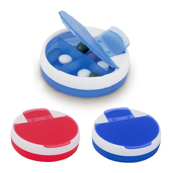 Original pastillero en diseño bicolor con tapa dispensadora de pastillas y 4 compartimentos interiores. 4 Compartimentos