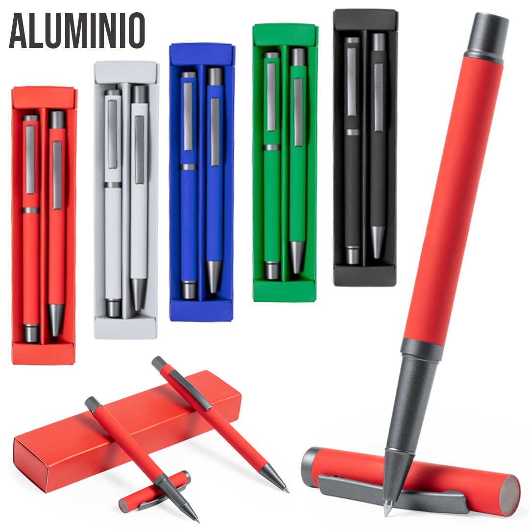 Elegante set de bolígrafo y roller. Bolígrafo de mecanismo pulsador y roller con capucha, ambos con clip metálico, carga jumbo y de tinta azul. Cuerpo en variados colores sólidos acabado goma y detalles metálicos en gris oscuro. Presentados en una caja de variados colores a juego con compartimentos interioriores separados. Bolígrafo y Roller. Carga Jumbo