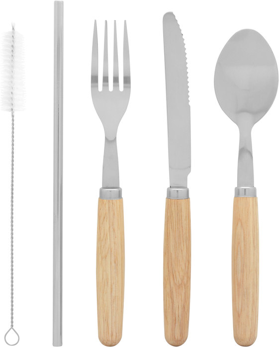 Acero Inoxidable 420. Set de cubiertos. 5 elementos: bombilla, cepillo para bombilla, cuchara, tenedor y cuchillo. Mango de madera para los 3 cubiertos. Todo el set está contenido en un estuche de canvas color crudo. Presentación en caja de regalo Kraft.