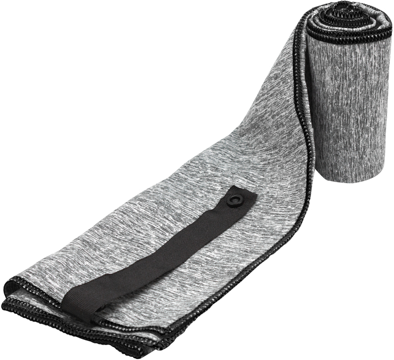 80 x 40 cm. Microfibra. Toalla de microfibra de secado rápido. Poliéster (200 g x m2) catiónico doble cara. Cinta negra que permite enrollar la toalla y aplicar logo.